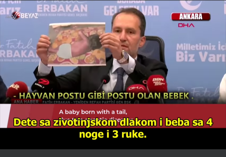 Na konferenciji za novinare vođa jedne turske stranke zajedno sa nazočnim lijećnicima pokazao slike novorođenčadi od “cijepljenih” roditelja , od kojih su neka rođena s repom, jednim okom, te četri noge i tri ruke, životinjskom dlakom.