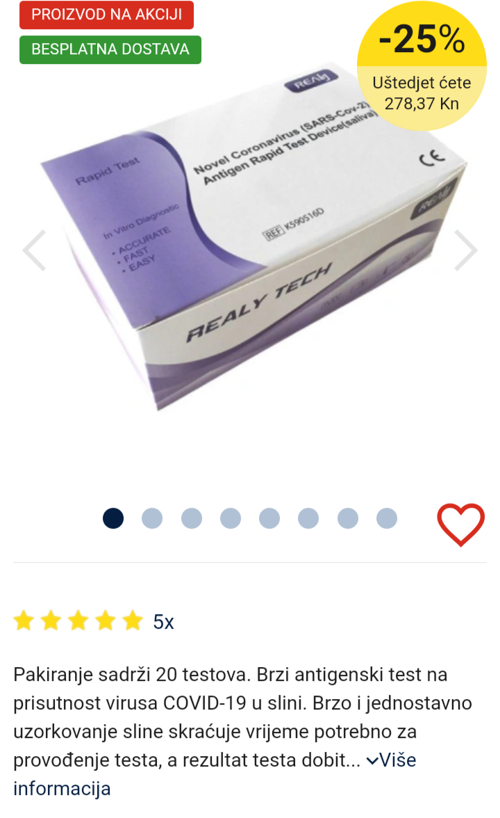 Pakiranje sadrži 20 testova. Brzi antigenski test na prisutnost virusa COVID-19 u slini. Brzo i jednostavno uzorkovanje sline skraćuje vrijeme potrebno za provođenje testa, a rezultat testa dobit.