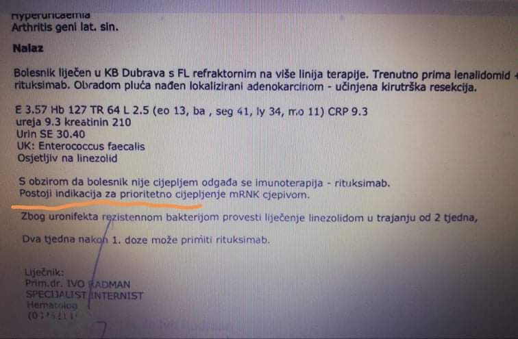 Pa su mu u nalazu zato napisali da “postoji indikacija za prioritetno. cijepljenje mRNK cjepivom”