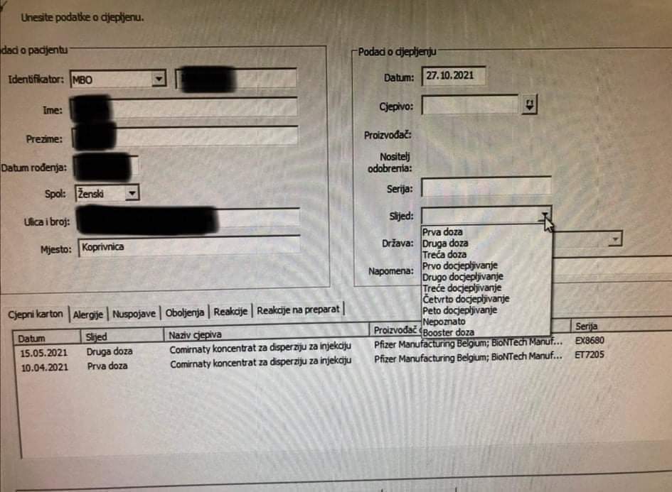 Netko je vjerojatno od zdravstvenih radnika to slikao tj. sigurno kako izgleda PC obrazac koje je dostavio HZZO za popunjavanje podataka o cijepljenoj osobi, odnosno kovid evidencija. Ništa to ne bi bilo čudno da u odjeljku “Slijed” ne stoji: Prva, druga, treća doza, prvo, drugo, treće, četvrto, peto docjepljivanje kao i booster doza, što znači da će biti minimalno osam cijepljenja za one koji vjeruju da su s trećom obavili svoju svetu vazalsku dužnost.