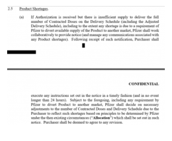 „’Pfizer će odlučiti o potrebnim prilagodbama broja ugovorenih doza i rasporeda isporuke koje Kupac ima … na temelju načela koja će utvrditi Pfizer … Smatrat će se da kupac pristaje na bilo koju reviziju.’“