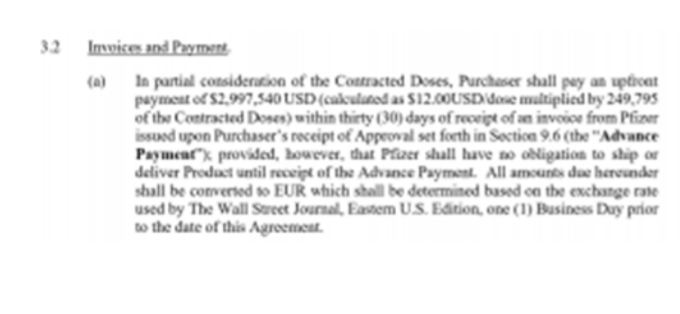 Morate platiti Pfizeru za doze koje ste naručili, bez obzira na to koliko ste konzumirali, bez obzira na to je li Pfizer to odobrio (to je bilo odobrenje prije EU-a) ili su isporučili ugovorene doze u skladu s bilo kojim procijenjenim rokovima isporuke navedenim ovdje .