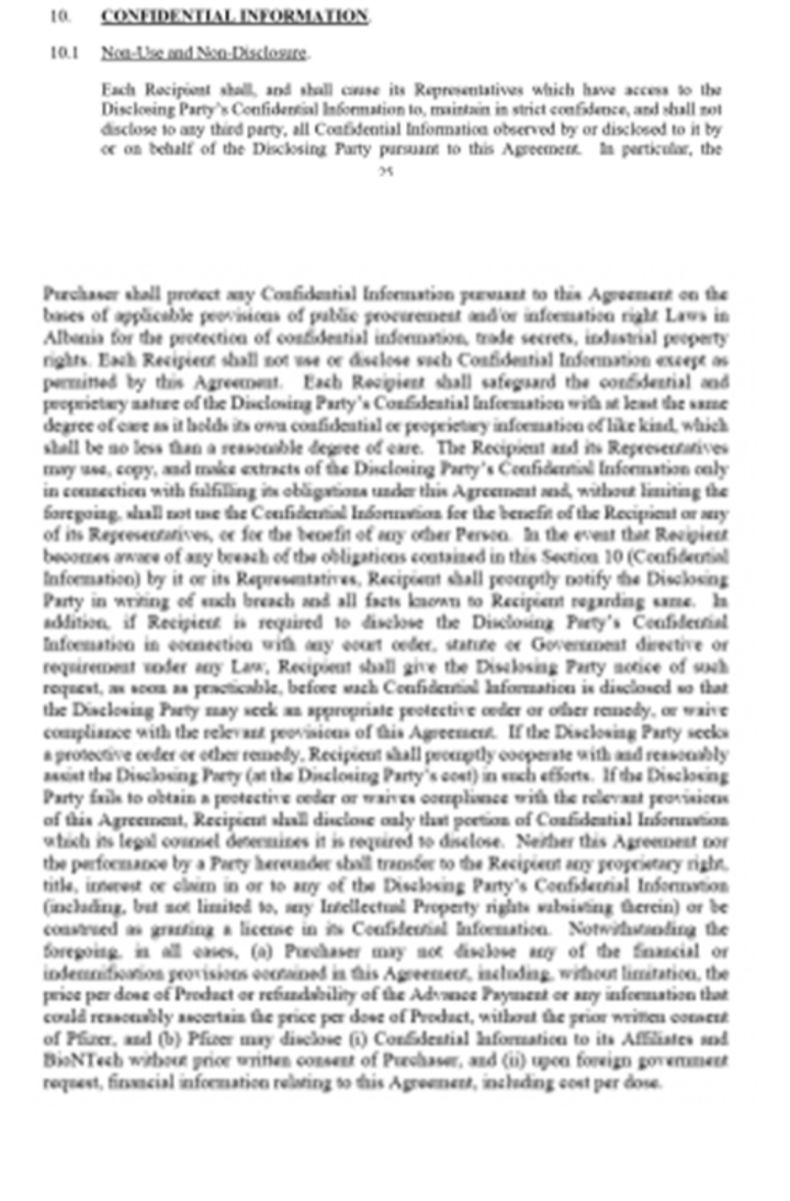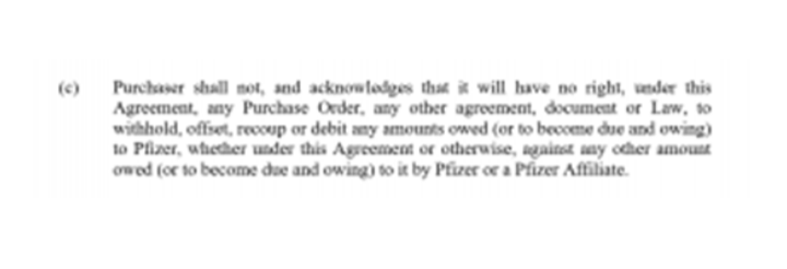 “Što se tiče plaćanja, zemlja nema pravo ‘uskratiti, prebiti, nadoknaditi ili zadužiti bilo koji iznos duga prema Pfizeru, bilo prema ovom Ugovoru ili na neki drugi način, u odnosu na bilo koji drugi iznos koji mu duguje (ili koji mu dospijeva i duguje) od strane Pfizera ili Pfizer Affiliate. „