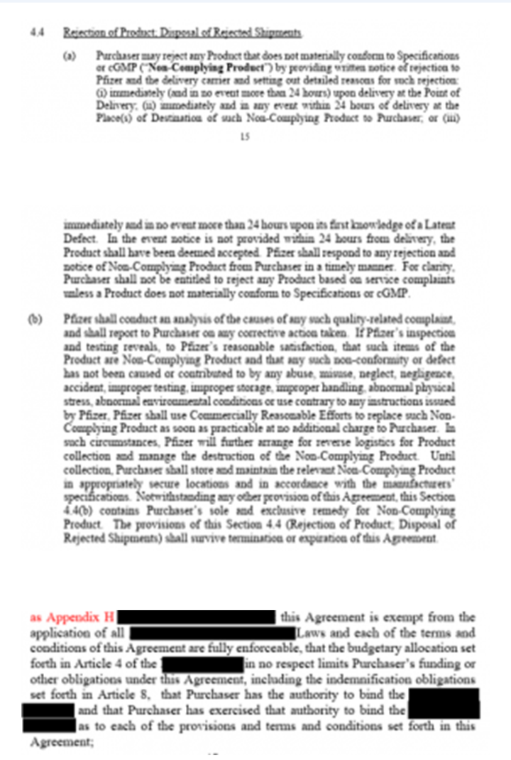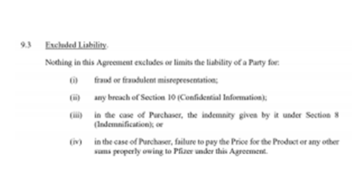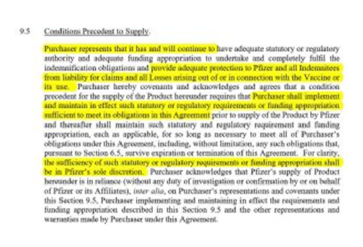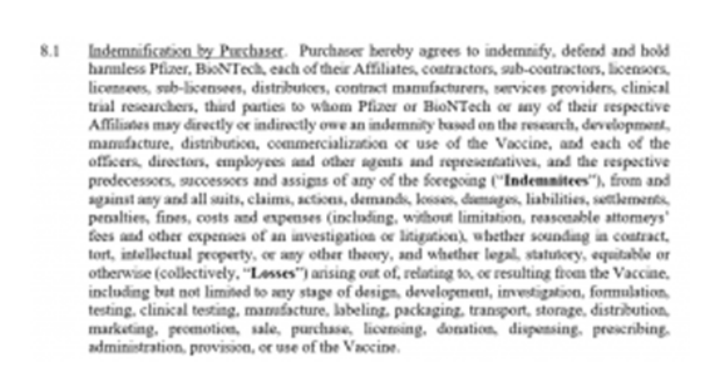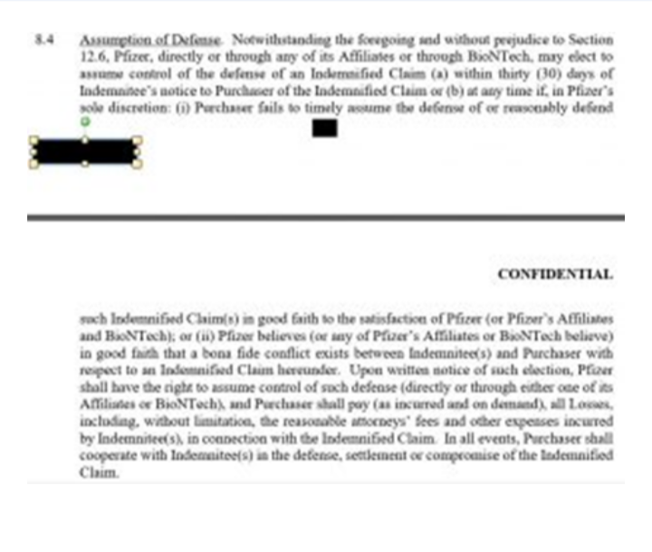“Država mora braniti Pfizer: “(Pfizer) će obavijestiti Kupca o gubicima za koje traži naknadu štete … Nakon takve obavijesti Kupac će odmah preuzeti vođenje i kontrolu obrane takvih odštetnih potraživanja u ime (Pfizer)„: