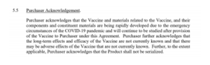 „Dugoročni učinci i učinkovitost:„ Kupac priznaje … dugoročni učinci i djelotvornost cjepiva trenutno nisu poznati te da mogu postojati štetni učinci cjepiva koji trenutno nisu poznati.“