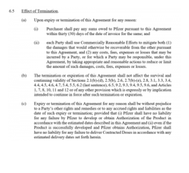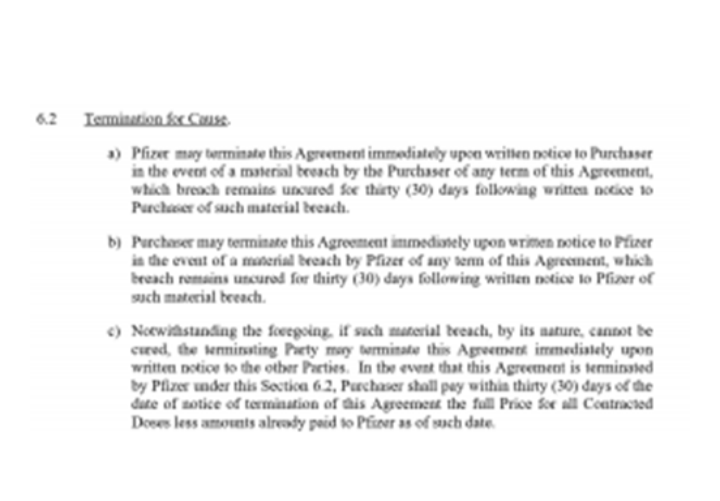 “Otkaz zbog uzroka: Postoje klauzule o mogućnosti raskida, ali zapravo, kao što ste do sada vidjeli, kupac nema gotovo ništa što se može smatrati značajnim kršenjem, dok Pfizer to može lako učiniti ako ne dobije svoj novac ili ako tako smatraju.