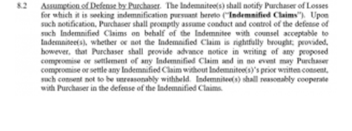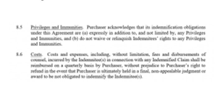 “Međutim, Pfizer ima pravo preuzeti kontrolu nad takvom obranom … a Kupac će platiti sve Gubitke, uključujući, bez ograničenja, razumne odvjetničke naknade i ostale nastale troškove.“