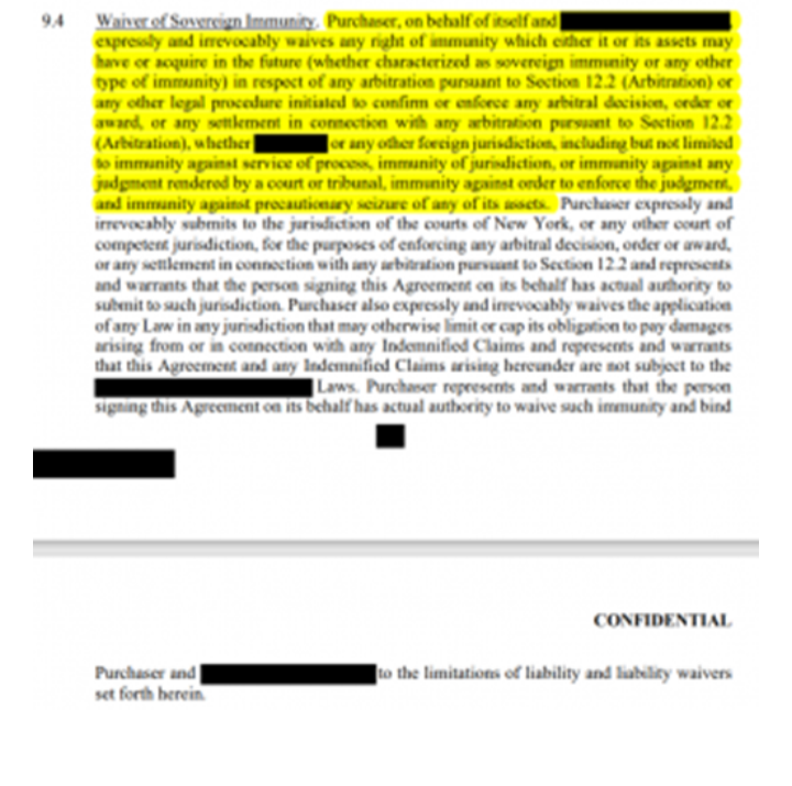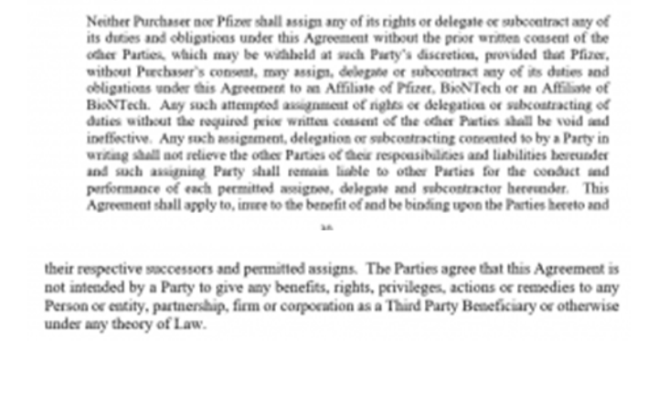 “Kupac se odriče svakog prava na imunitet, odustaje od bilo kojeg zakona koji bi mogao ograničiti obvezu plaćanja štete Pfizeru. Komentar: Sud u New Yorku ima sposobnost držati međunarodnu imovinu neke zemlje ako zemlja nije ispunila ugovor.