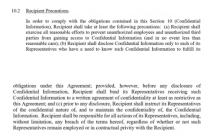„Povjerljivost, dio 2:„ Primatelj će otkriti povjerljive podatke samo svojim predstavnicima koji imaju potrebu znati takve povjerljive podatke kako bi ispunili svoje obveze prema ovom Ugovoru “: