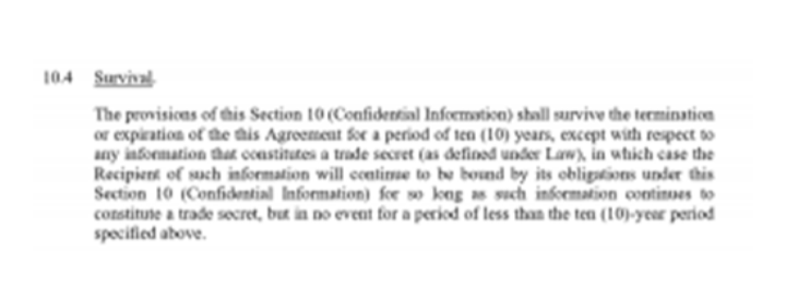 “„Odredbe ovog odjeljka 10 (Povjerljivi podaci) opstaju nakon prestanka ili isteka ovog Ugovora u razdoblju od deset (10) godina “: