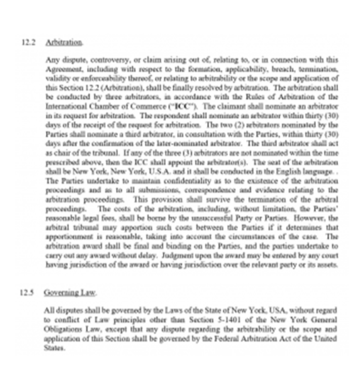 „Arbitraža i važeći zakoni: Arbitraža se mora voditi u New Yorku, prema Pravilima o arbitraži Međunarodne trgovačke komore, prema zakonima države New York, SAD: