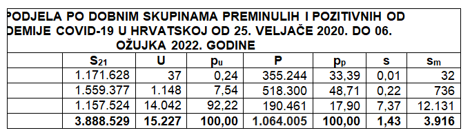 Oznake: D = dob u godinama, S21 = broj pripadnika dobne skupine u tisućama prema Državnom zavodu za statistiku popisa 2021. godine, ∑ = podatci za ukupni broj preminulih od COVID-19 bolesti do 06. ožujka 2022. godine ili pozitivnih na test, U = broj preminulih po dobnim skupinama od COVID-19, P = broj pozitivnih po dobnim skupinama, pu = U / ∑U x 100% = udio broja preminulih u dobnim skupinama na sto ukupno preminulih od COVID-19 bolesti, pp = P / ∑P x 100% = udio broja pozitivnih u dobnim skupinama na sto ukupno pozitivnih na test od COVID-19, s = U / P x 100% = broj preminulih na sto pozitivnih i sm = P / S21 x 106 = broj preminulih po dobnim skupinama na milijun stanovnika popisan 2021. godine. Broj preminulih u Hrvatskoj na milijun stanovnika popisanih 2021. godine iznosi 3.916.