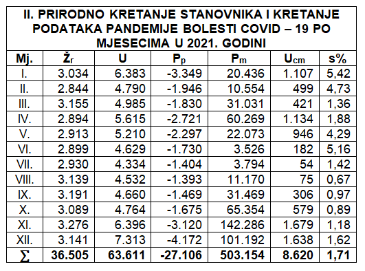 Oznake: Mj. = mjesec, Žr = živorođeni, U = umrli tekućeg mjeseca, Pp = Žr – U = mjesečna prirodna promjena ( – odgovara padu ) broja stanovnika u Hrvatskoj, Pm = mjesečni broj pozitivnih na COVID-19 test, Ucm = broj umrlih od COVID-19 ili s tom bolešću tijekom mjeseca, ∑ = ukupni podatci za 2021. godinu i s% = Ucm / Pm x 100% = broj umrlih na sto pozitivnih.