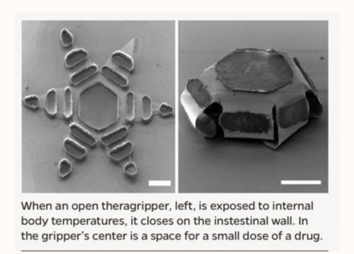Ovi maleni uređaji, poznati kao “Theragrippers”, izrađeni su od metala i tankog filma koji mijenja oblik. Prekriveni su kerozinskim voskom osjetljivim na toplinu i svaki nije veći od čestice prašine. Vidi sl.1.