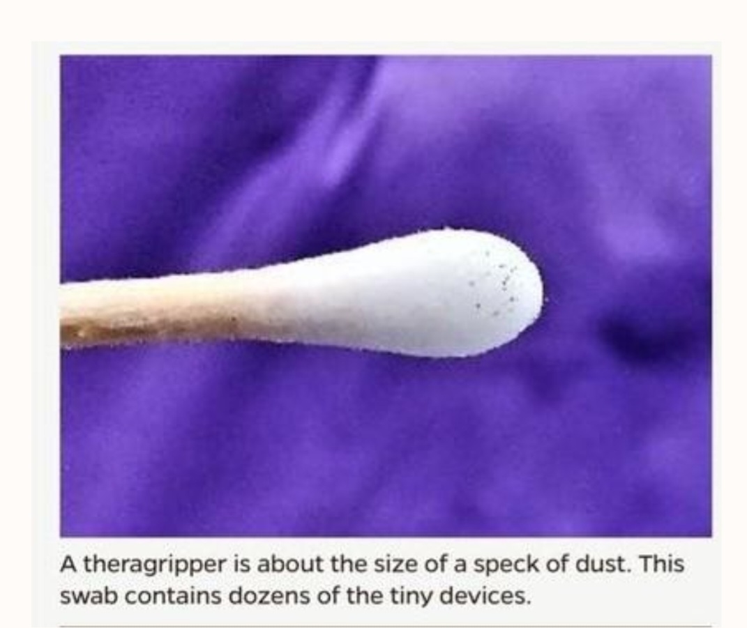 Kada ovi uređaji veličine prašine dosegnu određenu temperaturu, zakače se za tkivo i otpuste lijek koji je na njih napunjen. Ova nanotehnologija obećava u laboratorijskom okruženju. Međutim, još je u povojima i nije odobren za upotrebu kod ljudi.” Theragrippers nisu niti testirani niti korišteni za isporuku cjepiva, dodao je glasnogovornik.
