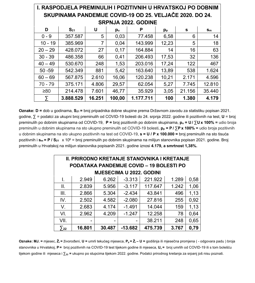 Od početka Covid-19 pandemije do 29. Srpnja 2022. godine u svijetu je bilo 577.419.168 pozitivnih na COVID-19 test odnosno oko 7,31% od svjetske populacije, a umrlo je 6.415.033 ili 1,11% od broja pozitivnih, a na milijun stanovnika svijeta umrlo je 812. U Hrvatskoj je do 24. Srpnja 2022. godine bilo 1.177.711 pozitivnih na COVID -19 test ili 30,29% od broja stanovnika popisanih 2021.godine, a umrlo je 16.251 odnosno 1,38% od broja pozitivnih ili na milijun stanovnika 4.179, a to je 5,15 puta više od svjetskog prosjeka. Prosječna dob ukupno umrlih od početka COVID – 19 – pandemije do 24. srpnja 2022. godine u Hrvatskoj iznosi oko 76 godina. Očekivano trajanje života od 2011. do sredine 2020. godine kretalo se između 76,9 i 78,5, a sredinom 2020. godine bilo je 78,8 godina. Ukupni broj umrlih do 24.srpnja kod dobnih skupina do mlađih od 60 godina je 1.234 ili 7,6% od ukupno umrlih od ili s COVID-19, a broj pozitivnih je 959.490 ili 81,47% od ukupno pozitivnih. Smrtnost iznosi 0,13% i broj mrtvih na milijun stanovnika 1.053. Za dobne skupine starije od 59 godina ukupni broj umrlih je 15.017 ili 92,4%, a pozitivnih je bilo 218.221 ili 18,53%. Smrtnost iznosi 6,88% i broj umrlih na milijun stanovnika 12.973. U II. priloženoj tablici dani su podatci za prirodno kretanje stanovnika i kretanje pandemije COVID-19 za prvih šest mjeseci ove godine. Živorođeno je 16.801, umrlo je 30.487, a od toga je umrlo od ilii s COVID-19 3.519. Pozitivno na test za koronu je bilo 437.528, a smrtnost za prvih šest mjeseci ove godine iznosi 0,8%. U srpnju je bilo pozitivno na testiranju 38.815 osoba, a umrlo je od ili s koronom 248 osoba. Smrtnost u srpnju iznosi 0,65%.