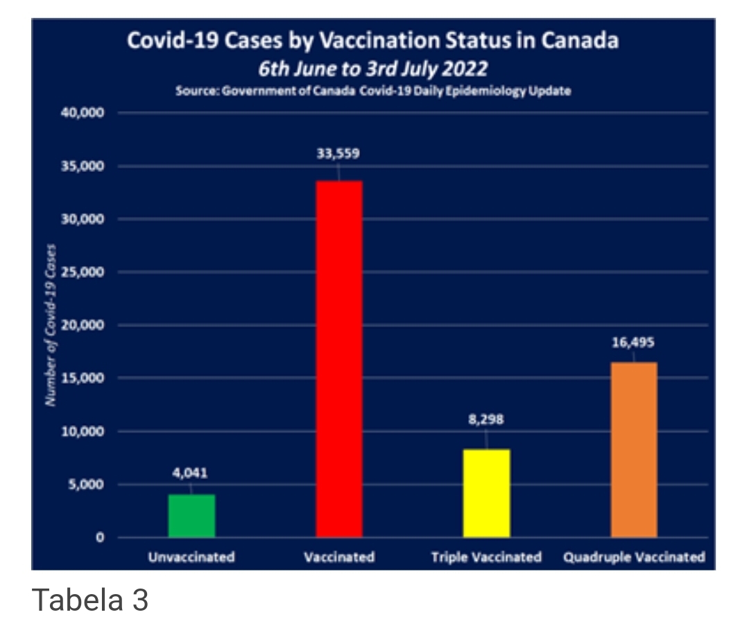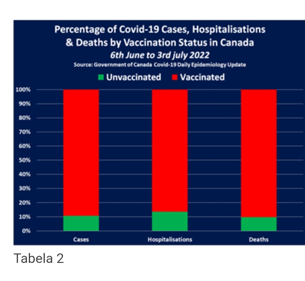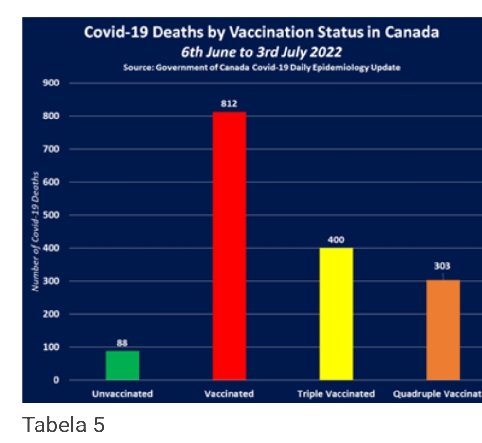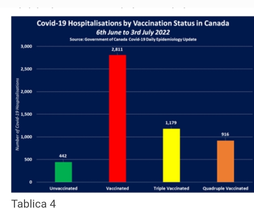 Vlada Kanade izdaje dnevno ažuriranu epidemiologiju Covid-19, u kojoj daje nove podatke o slučajevima Covid-19, hospitalizacijama i smrtnim slučajevima. Potvrdila je da je cijepljena populacija odgovorna za 90% smrtnih slučajeva od Covid-19 diljem Kanade tijekom prošlog mjeseca, pri čemu se velika većina tih smrti dogodila među trostruko i četverostruko cijepljenom populacijom. (Trudeau’s Government confirms the Quadruple/Triple Vaccinated have accounted for 90% of Covid-19 Deaths across Canada since the beginning of June).