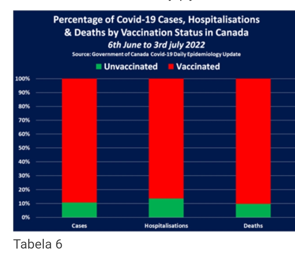 Unatoč masovnoj kampanji cijepljenja i kanadskoj vladi koja to očajnički pokušava prikriti, malo vremena, truda i jednostavna matematika otkrili su da je 9 od svakih 10 slučajeva Covid-19 zabilježeno hospitalizacija i smrt među potpuno cijepljenom populacijom između 6. lipnja i 3. srpnja 2022., a velika većina njih bila je među trostruko ili četverostruko ubodenima.