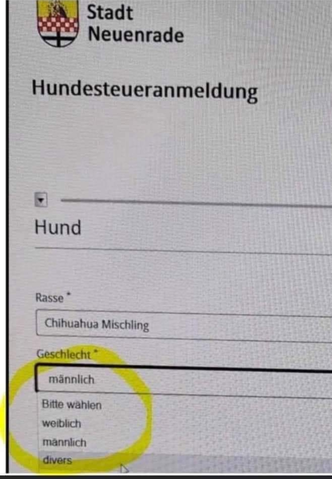Nude mogućnost psu za muški ženski i onaj nesvrstani spol. Samo nije jasno kako pas odlučuje o svom spolu u formularu ili kako njegov vlasnik zna da bi se pas u formularu izjasnio kao neopredjeljeni…