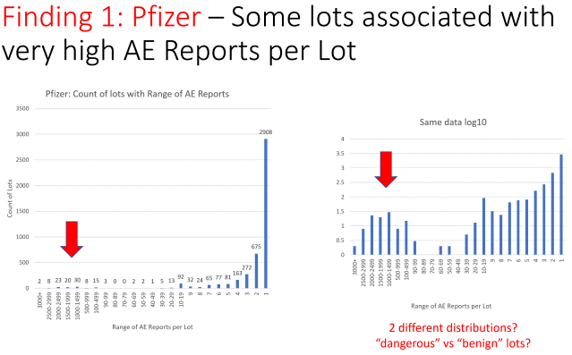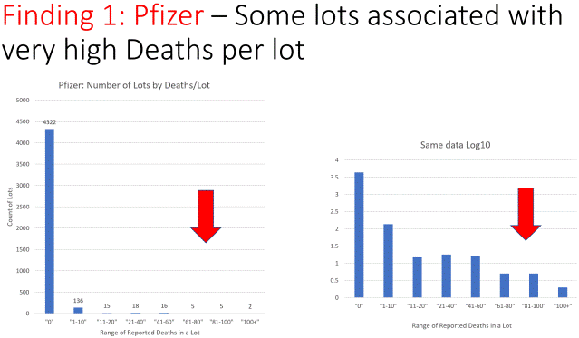 To sugerira da je postojao mali broj opasnih serija Pfizerovog cjepiva protiv Covid-19 i velika količina naizgled bezopasnih (barem kratkoročno) serija Pfizerovog cjepiva protiv Covid-19.