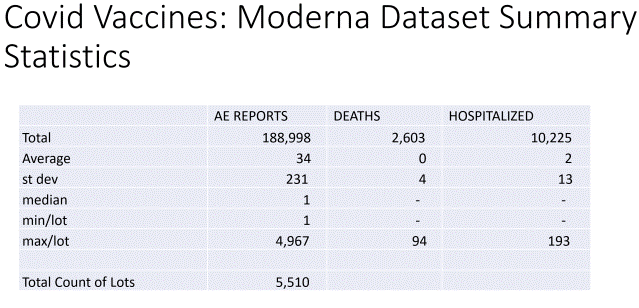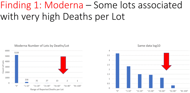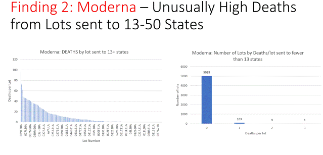 Isto se može vidjeti i za cjepivo Moderna Covid-19. Devedeset pet posto serija Moderna cjepiva nije imalo niti jedan smrtni slučaj protiv njih. Što znači da su 2603 smrtna slučaja bila povezana sa samo 5% serija cjepiva Moderna.
