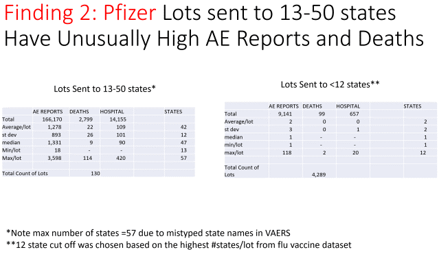 Istraga podataka VAERS-a također je otkrila da su određene serije cjepiva Pfizer i Moderna Covid-19 koje su distribuirane u između 13 i 50 država diljem SAD-a imale neuobičajeno visok broj prijava nuspojava i smrtnih slučajeva u usporedbi s serijama koje su distribuirane u 12 država ili manje diljem SAD-a