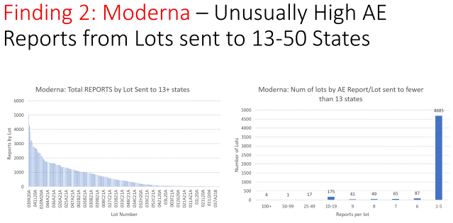 Gornji grafikon s lijeve strane prikazuje broj izvješća o nuspojavama protiv cjepiva Moderna prema broju serije poslanih u 13 ili više država diljem SAD-a. Ovaj grafikon identificirao je stvarne brojeve serija cjepiva Moderna koje je izazvalo najviše štete u SAD-u.