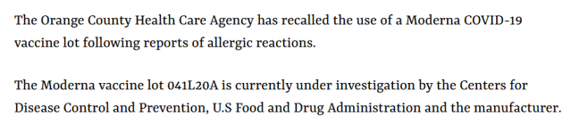 Drugoj najštetnijoj seriji cjepiva Moderna dodijeljen je broj serije ‘041L20A’, a medijska izvješća pokazuju da ga je Agencija za zdravstvenu zaštitu okruga Orange zapravo povukla u siječnju 2021. nakon izvješća o alergijskim reakcijama.