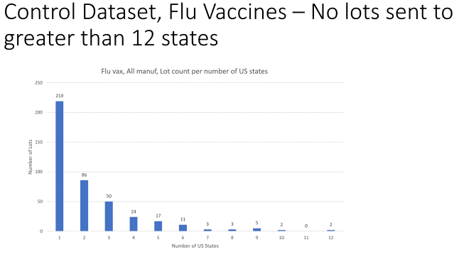 Podaci VAERS-a pokazuju da je 44% lotova (219 / 494) poslano u samo jednu državu unutar SAD-a, dok je daljnjih 17% (86 / 494) poslano u 2 države, 10% (50 / 494) je poslano u 3 države, 5% (24 / 494) poslano je u 4 države, 3% (17 / 494) poslano je u 5 država, 2% (11 / 494) poslano je u 6 država, a samo 0,4 (2 / 494) poslani su u 12 država unutar SAD-a.