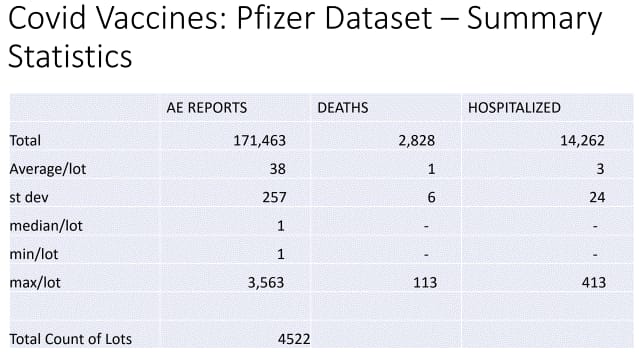 Ovi podaci, dakle, pokazuju da je svaki lot od 130 različitih brojeva serija Pfizerovog cjepiva protiv Covid-19 distribuiranog u više od 13 država, u prosjeku oštetio 639 puta više ljudi, hospitalizirao u prosjeku 109 puta više ljudi i ubio u prosjeku 22 puta više ljudi.