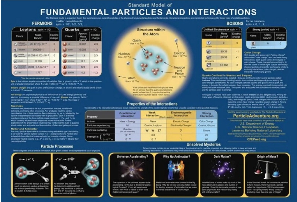 Ovaj dijagram čestica i međudjelovanja detaljno prikazuje kako čestice Standardnog modela međusobno djeluju prema tri temeljne sile koje opisuje kvantna teorija polja. Kada se gravitacija doda u mješavinu, dobivamo vidljivi svemir koji vidimo, sa zakonima, parametrima i konstantama za koje znamo da njime upravljaju. Misterije, poput tamne materije i tamne energije, još uvijek postoje.