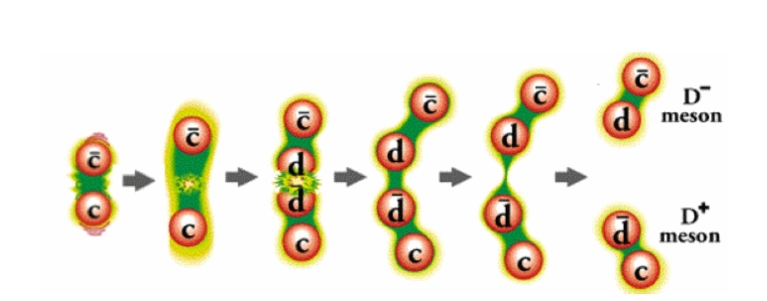 Kada mezon, kao što je ovdje prikazana čestica charm-anticharm, ima svoje dvije sastavne čestice previše razdvojene, postaje energetski povoljno iščupati novi (lagani) par kvark/antikvark iz vakuuma i stvoriti dva mezona gdje je prije bio jedan. Dovoljno jako električno polje, za dovoljno dugovječne mezone, može uzrokovati ovo, s potrebnom energijom za stvaranje masivnijih čestica koja dolazi iz temeljnog električnog polja.