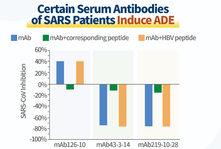 Kao što je prikazano na donjem grafikonu, plave trake predstavljaju sposobnost različitih antitijela da spriječe ulazak virusa u stanice. Stoga, krajnje lijevo antitijelo štiti stanice. Međutim, druga dva antitijela ne samo da nisu imala zaštitnu moć, već su također poticala virusnu infekciju stanica, što je ADE fenomen.