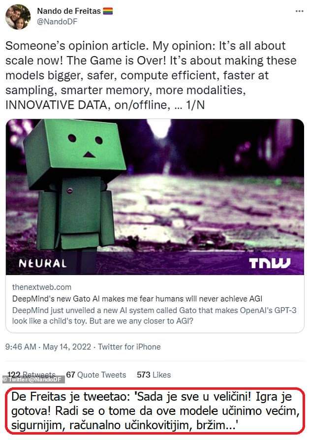 Nando de Freitas, znanstveni znanstvenik u DeepMindu i profesor strojnog učenja na Sveučilištu Oxford , rekao je da je ‘igra gotova’ u pogledu rješavanja najtežih izazova u utrci za postizanjem opće umjetne inteligencije (AGI).