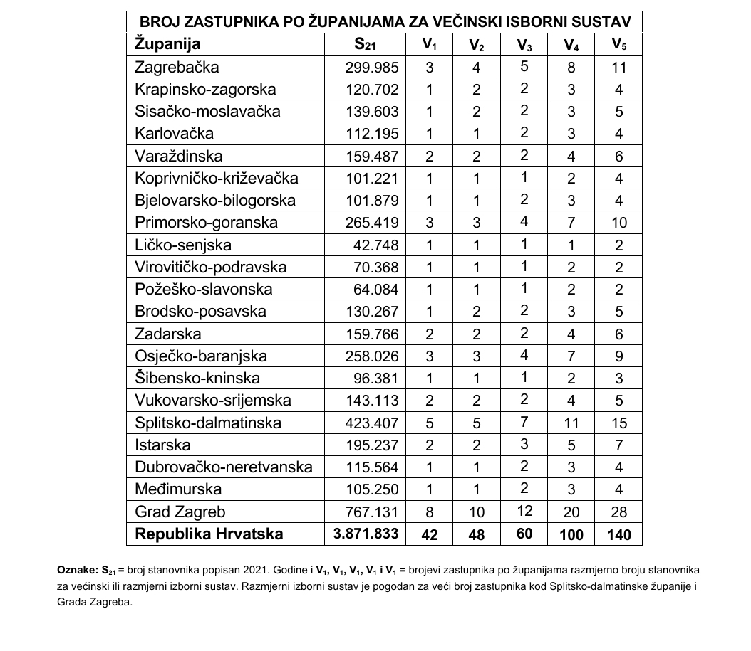 z1 = G1/G x Z = 82.628/248.887 x 14 = 4,65, a zaokruženo na cijeli broj 5 zastupničkih mjesta,