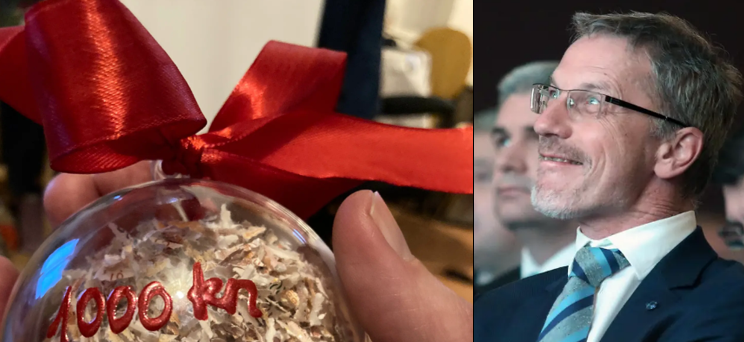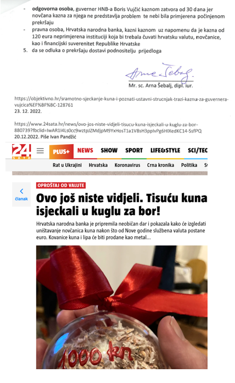 Mediji su 22. 12. 2022. objavili da je na redovnom brifingu HNB-a novinarima poklonjena plastična kugla s izrezanim kunama. Preciznije 10 novčanica po 100 kuna izrezanih u rezance stavljeno je u plastičnu kuglu s očitom željom da to novinari stave na svoja božićna drvca.