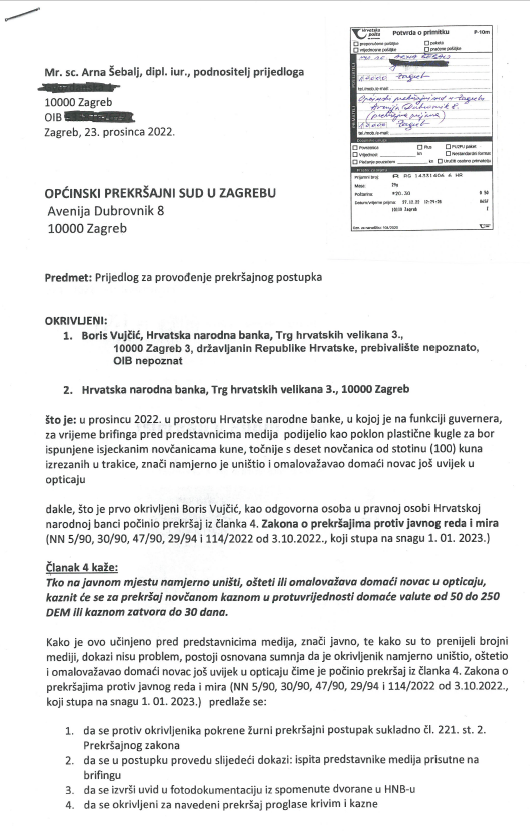 Danas, nakon svega ne očekujem baš ništa od ove formalnopravno ispravne prijave Općinskom prekršajnom sudu u Zagrebu u kojoj sam prijavila kao okrivljene guvernera Hrvatske narodne banke Borisa Vujčića kao odgovornu osobu kao i samu Hrvatsku narodnu banku kao pravnu osobu.