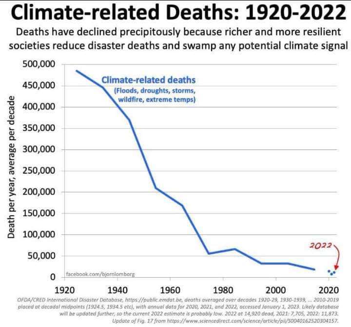 Klimatske promjene su stvarne i njihovi su učinci uglavnom negativni, ali uobičajeni prikazi razaranja su neutemeljeni. Scenariji postavljeni pod UN-ovim panelom o klimi (IPCC) pokazuju da će se dobrobit ljudi vjerojatno povećati na 450% današnjeg blagostanja tijekom 21. stoljeća. Klimatske štete će smanjiti ovo povećanje blagostanja na 434%.