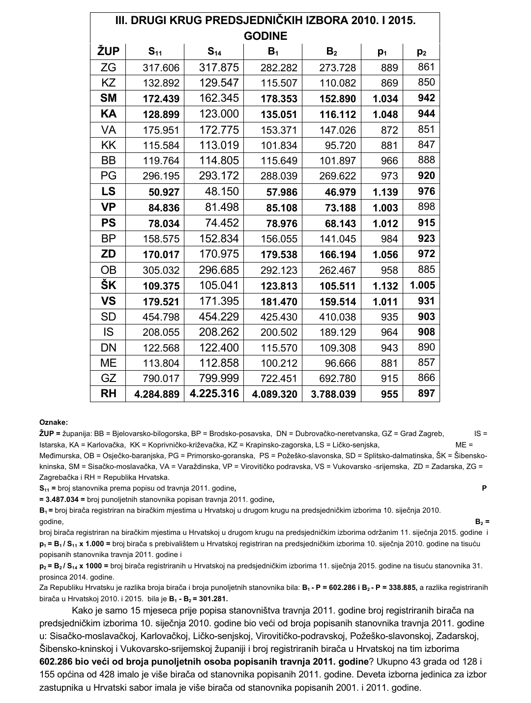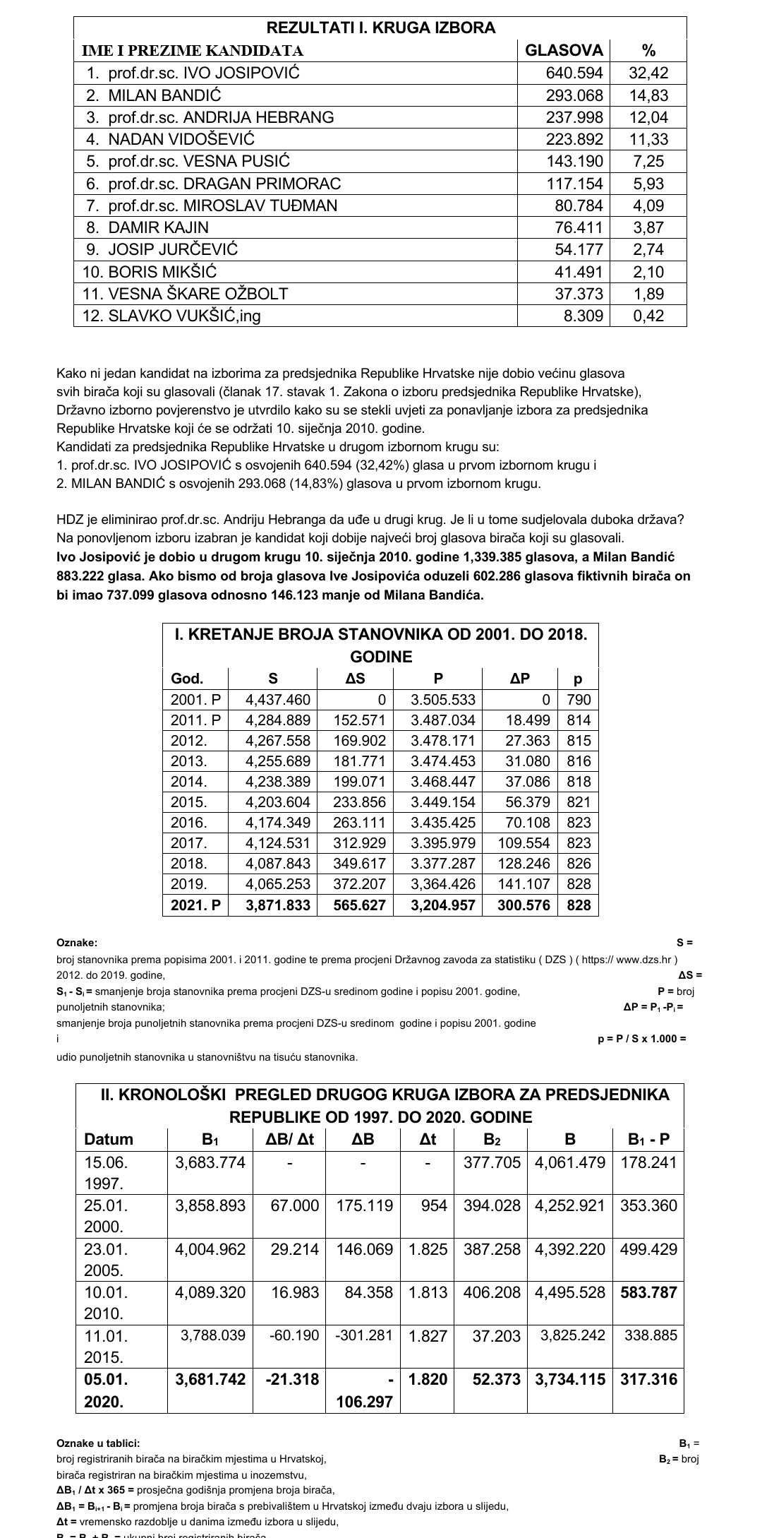 Na izborima za predsjednika Republike održanim 10 siječnja 2010. godine u drugom krugu bilo je registrirano na biralištima u Hrvatskoj 4.089.320 birača, a u inozemstvu 406.320. Nemoguće je da je od 25. siječnja 2000. do 10. siječnja 2010. godine 230.427 više birača s prebivalištem u Hrvatskoj steklo biračko pravo punoljetnošću nego što ih je umrlo ili iselilo. Prirodni prirast stanovnika je od 1977. godine manji od 22 tisuća, a od 1991. više stanovnika umire nego ih se rađa. Ova analiza izaziva osnovanu sumnju na namještanje rezultata izbora za predsjednika Republikeodržane2010.godine. U drugom krugu na predsjedničkim izborima održanim 11. siječnja 2015. bio je na biralištima u Hrvatskoj 301.281 registrirani birač manje nego u drugom krugu na predsjedničkim izborima održanim 10. siječnja 2010. godine. Podatci o broju registriranih birača na biralištima u Republici Hrvatskoj ukazuju na grubu manipulaciju brojem birača s prebivalištem u Hrvatskoj.