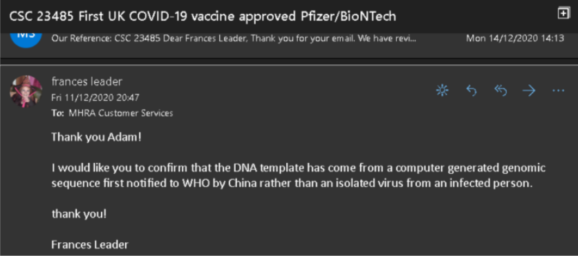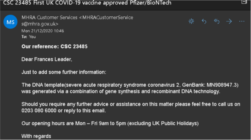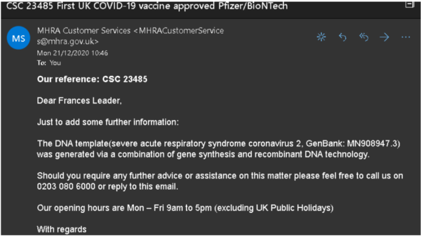 Lanac e-pošte izgledao je predobro da bi bio istinit. Jer, laički rečeno, njihovo priznanje je dimni pištolj koji dokazuje da je pandemiju Covid-19 stvorio čovjek. SARS-CoV-2 je sintetiziran prema MHRA. Nije bila izolirana od prirode. Pa sam odlučio sam pisati MHRA. Ovo je moj lanac e-pošte, čiju sam kopiju poslao na Expose…