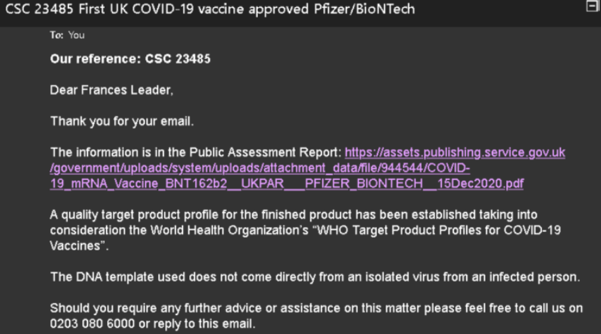 Potvrđujemo da su odgovori e-poštom Frances Leader o Pfizerovom cjepivu autentični.
