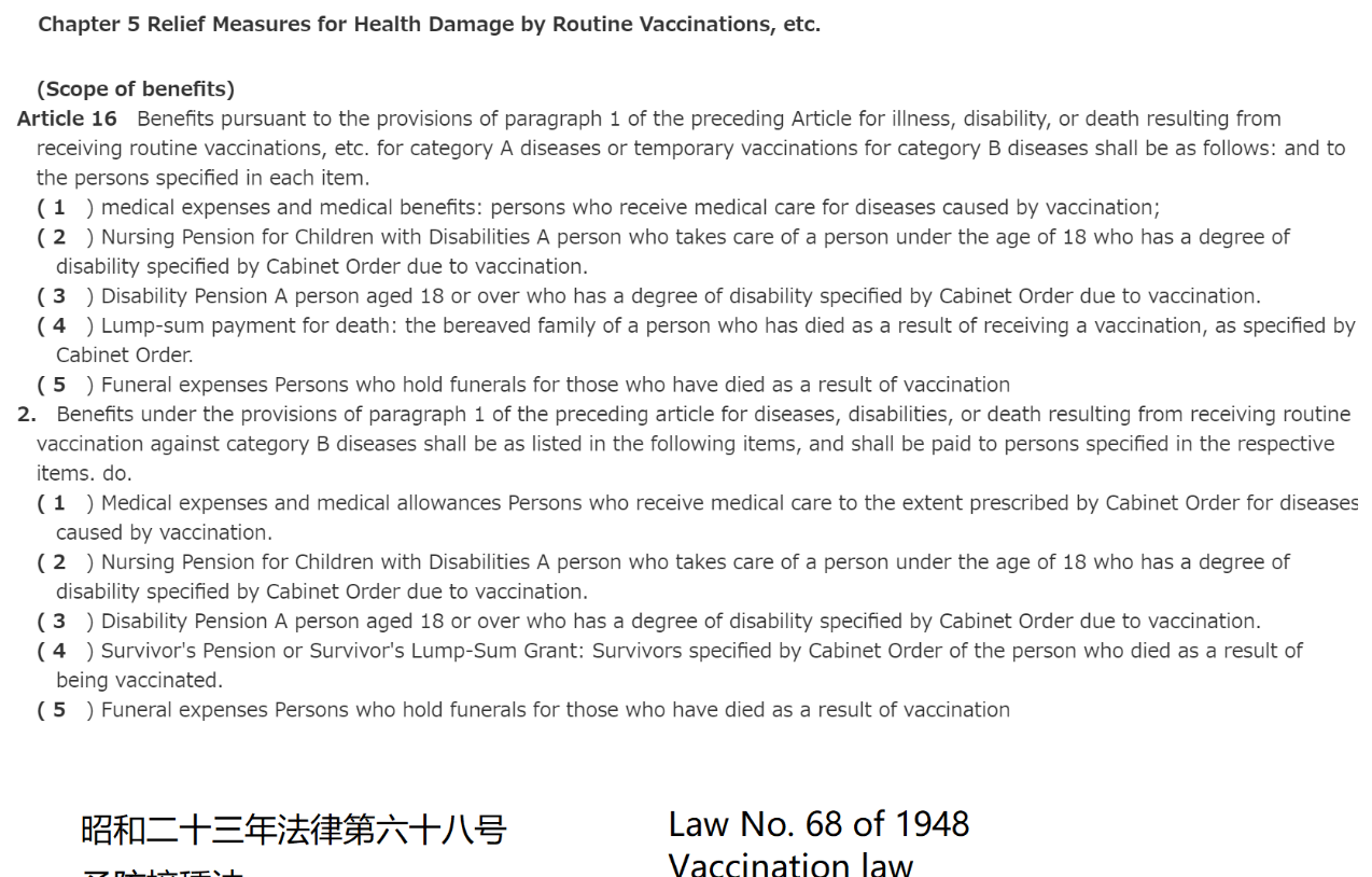 Japanski zakon već predviđa odštetu za oštećene „cjepivom“, pa profesor Fukushima tvrdi da bi to trebalo primijeniti sada. Japanski zakon o cijepljenju opisuje opseg pogodnosti na sljedeći način (računalni prijevod s njihove web stranice):