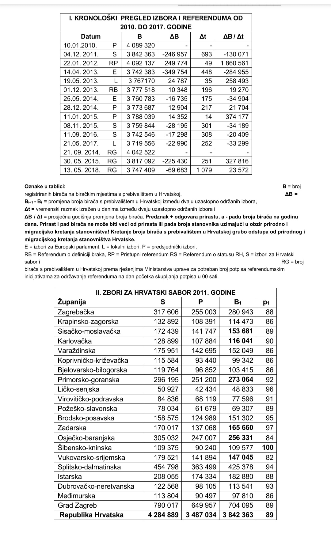Analizom kretanja birača na izborima i referendumima od drugog kruga izbora za predsjednika Republike Hrvatske održanog 10. siječnja 2010. godine na kojima je bilo prema Izvješću DIP-a 4 089 320 registriranih birača na biralištima u Hrvatskoj do 13. svibnja 2018. godine u 00 sati , a za taj datum je ministar uprave donio Rješenje o 3 747 409 birača u 00 sati, mi u građanskoj inicijativi ” Ne Istabulskoj konvenciji “, udruzi Korektiv” i članovi ” Hrvatskog sabora u sjeni” otkrili smo da postoji osnovana sumnja na počinjenje kaznenih dijela prema člancima: 329., 279. i 337. KZRH vlade Republike Hrvatske za izbore za predsjednika Republike 10. siječnja 2010. i izbore za Hrvatski sabor 4. prosinca 2011. godine, Pristupni referendum za Europsku uniju 22. siječnja 2012. godine te za rješenja o broju registriranih birača na dan 21. rujna 2014., 30. svibnja 2015. i za 13. svibnja 2018. godine u 00 sati na temelju kojih je određen broj potrebnih potpisa za održavanje referenduma koje su pokrenule građanske inicijative “Birajmo zastupnike imenom i prezimenom”, “Referendum o referendumu”, “Narod odlučuje” i “Ne Istanbulskoj konvenciji”. Prema priloženim tabličnim prikazima kretanja birača od. 10. siječnja 2010. godine može se dokazati da postoje skokovite promjene broja registriranih birača s prebivalištem u republici Hrvatskoj koje grubo odstupaju od prirodnog i migracijskog kretanja stanovništva te popisa stanovništva provedenog 2011. godine ( vidi priloženu tablicu Kronološki pregled izbora i referenduma od 2010. do 2017. godine i ostale tablice.)