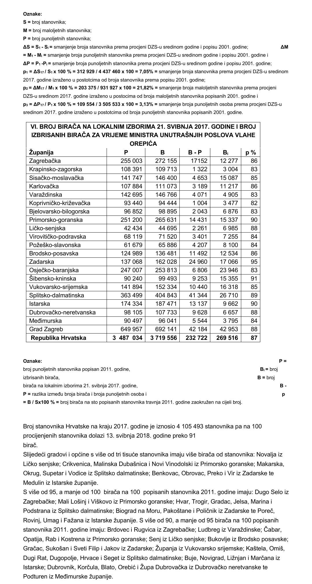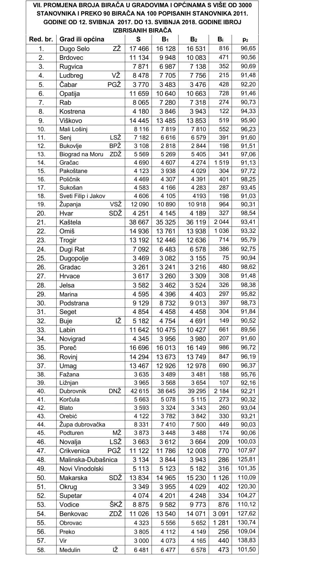 6. Promjena broja birača u gradovima i općinama s više od tri tisuće stanovnika i preko 90 birača na sto popisanih stanovnika 2011. godine od 12. svibnja 2017. do 13. svibnja 2018. godine.