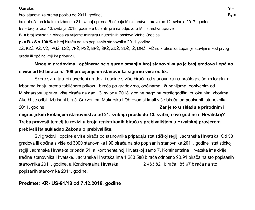 – da je ispunjena pretpostavka iz članka 87. stavka 1. Ustava, – da nije ispunjena pretpostavka iz članka 87. stavka 3. Ustava. II. U povodu zahtjeva Organizacijskog odbora Građanske inicijative »U ime obitelji« nije dopušteno raspisivanje referenduma iz točke I. ove izreke jer je prema očitovanju tog odbora raspisivanje referenduma zatražilo 380.649 birača, a njegovo raspisivanje trebala su zatražiti 404.252 birača s obzirom da su na dan 21. rujna 2014. u Republici Hrvatskoj bila registrirana 4.042.522 birača. Grubom manipulacijom brojem birača tadašnja je saborska većina spriječila referendumsko izjašnjavanje o izbornom zakonodavstvu za izbor zastupnika u Hrvatski sabor i time uz pomoć ustavnih sudaca prekršila I. članak Ustava Republike Hrvatske. Na drugim izborima za Eu parlament održanim 25. svibnja 2014. godine bilo je registrirano na biralištima u Hrvatskoj 3 760 783 birača, a samo 118 dana kasnije bivši ministar uprave Arsen Bauk je potpisao ispravu da je na dan početka skupljanja potpisa na peticiju građanske inicijative ” Glasujmo imenom i prezimenom” 21. rujna 2014. godine u 00 sati bilo 4 042 522 birača s prebivalištem u Hrvatskoj te da je potrebno 404 252 potpisa za održavanje referenduma. Nemoguće je da je za 118 dana 281 739 naših stanovnika s prebivalištem u Hrvatskoj steklo biračko pravo punoljetnošću više nego ih je umrlo. Dakle građanska inicijativa ” Glasujmo imenom i prezimenom” je skupila dovoljno potpisa birača na peticiju za održavanje Referenduma o izbornim pravilima. Kako se broj birača s prebivalištem u Hrvatskoj iz evidencije u Registru birača od 21. rujna 2014. do 30. svibnja 2015. godine u 00 sati prema Rješenju koje je potpisao bivši ministar Arsen Bauk smanjio za samo 251 dan za 225 430 birača sa 4 042 522 na 3 817 092 neka nama hrvatskim biračima dokažu: ministar Lovro Kuščević i njegov pomoćnik gospodin Nakić? Jedan od ova dva podatka sigurno nije istinit, a to je podatak na ispravi koji su prihvatili ustavni sudci za 21. rujna 2014. godine u 00 sati. Za takvo smanjenje broja birača treba godišnje da preko 327 816 birača umre više nego ih punoljetnošću stekne biračko pravo. Prema podatcima DZS-u tijekom razdoblja od 21. rujna 2014. do u 13. svibnja 2018. godine umrlo je manje od 212 293 stanovnika ( uglavnom birača ), a prema Rješenju ministra uprave Lovre Kuščevića za 13. svibnja 2018. godine u 00 sati broj birača s prebivalištem u Hrvatskoj je pao na 3 747 409 birača za 1 330 dana za 295 113 birača. Iz toga zaključujemo da je godišnje više od 80 989 birača umiralo nego ih je stjecalo biračko pravo punoljetnošću. Nikada godišnje u Hrvatskoj nije umrlo više od 56 tisuća državljana! Ovo je dokaz da vlade Republike Hrvatske grubo manipuliraju registrom birača, a to je kazneno djelo udruženog zločinačkog poduhvata gušenja neposredne demokracije Vlade Zorana Milanovića? Vlada Andreja Plenkovića nastavlja gušiti neposrednu demokraciju provjerom potpisa i manipulacijom Registrom birača. Kako se broj birača od 12. svibnja 2017. do 13. svibnja 2018. godine povećao za 28 252 birača s prebivalištem u Hrvatskoj neka nam dokaže ministar Lovro Kuščević?
