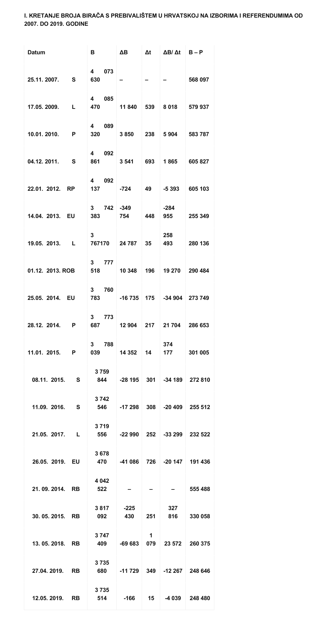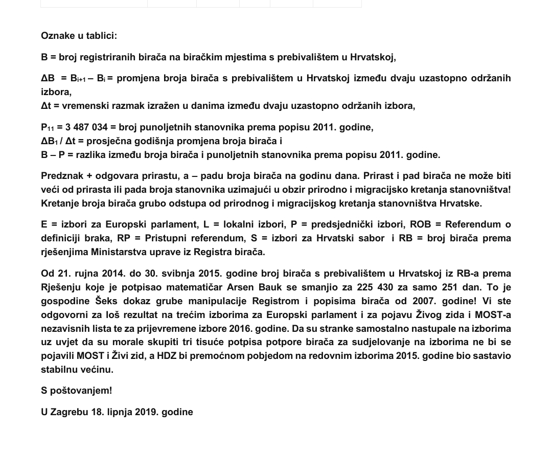 Kako se broj birača s prebivalištem u Hrvatskoj iz evidencije Registra birača s prebivalištem u Hrvatskoj od 21. rujna 2014. do 30. svibnja 2015. godine u 00 sati prema Rješenju koje je potpisao bivši ministar Arsen Bauk smanjio za samo 251 dan za 225 430 birača sa 4.042.522 na 3.817.092 neka nama hrvatskim biračima dokažu bivši ministar Arsen Bauk i ustavni sudci? Jedan od ova dva podatka sigurno nije istinit, a to je podatak na ispravi (ako postoji) koji su prihvatili ustavni sudci za 21. rujna 2014. godine u 00 sati. Za takvo smanjenje broja birača treba godišnje da preko 327.816 birača umre više nego ih punoljetnošću stekne biračko pravo. Prema podatcima DZS-u tijekom razdoblja od 21. rujna 2014. do 13. svibnja 2018. godine umrlo je manje od 212.293 stanovnika (uglavnom birača), a prema Vašem Rješenju gospodine ministre Lovro Kuščeviću za 13. svibnja 2018. godine u 00 sati broj birača s prebivalištem u Hrvatskoj je pao na 3.747.409 birača za 1330 dana za 295.113 birača. Iz toga zaključujemo da je godišnje više od 80 989 birača trebalo umrijeti nego ih je stjecalo biračko pravo punoljetnošću. Nikada godišnje u Hrvatskoj nije umrlo više od 56 tisuća državljana! Ovo je dokaz da vlade Republike Hrvatske grubo manipuliraju registrom birača, a to je kazneno djelo udruženog zločinačkog pothvata gušenja neposredne demokracije Vlade Zorana Milanovića i Andreja Plenkovića? Vlada Andreja Plenkovića nastavila je gušiti neposrednu demokraciju provjerom potpisa i manipulacijom registrom birača s prebivalištem u Hrvatskoj. Kako se broj birača od 12. svibnja 2017. do 13. svibnja 2018. godine povećao za 28 252 birača s prebivalištem u Hrvatskoj? Prema izjavi zastupnika Vlahe Orepića u emisiji “Dogmatica” na Z1 televiziji 4. prosinca 2018. godine da vlasti Republike Hrvatske sprječavaju načelnike policijskih stanica u sređivanju Registra birača provjeravanjem prebivališta. Demografi prof. dr. sc. Stjepan Šterc i prof. dr. sc. Anđelko Akrap tvrde da u Hrvatskoj ima između 3,3 i 3,4 milijuna birača s prebivalištem u zemlji. Prema izjavi bivšeg ministra unutarnjih poslova Vlahe Orepića za Slobodnu Dalmaciju trebalo je iz Registra birača s prebivalištem u Hrvatskoj izbrisati 269 516 birača. U prilogu tablični prikazi potvrđuju Orepićove navode. Građanska inicijativa “Narod odlučuje” je skupila više od 10 % potpisa birača s prebivalištem u Hrvatskoj i bez potpisa birača koje je Vaše Povjerenstvo proglasilo nevažećim.
