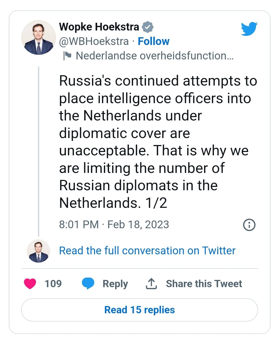 Mjesec dana nakon ruske invazije u ožujku 2022., nizozemska vlada rekla je da protjeruje 17 ruskih obavještajaca “zbog prijetnje nacionalnoj sigurnosti koju predstavlja ova skupina”.