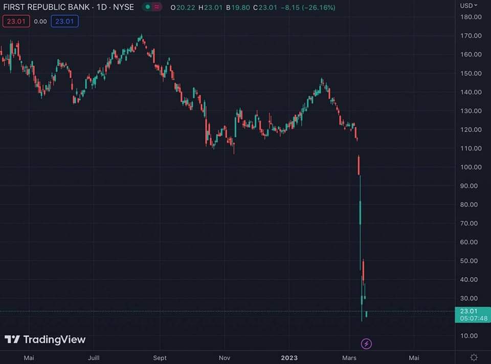 Dionice 14. najveće banke u Sjedinjenim Državama, First Republic Bank, pale su više od 30% na otvaranju američkih tržišta. Tijekom tjedna dionice banke pale su za više od 80%.