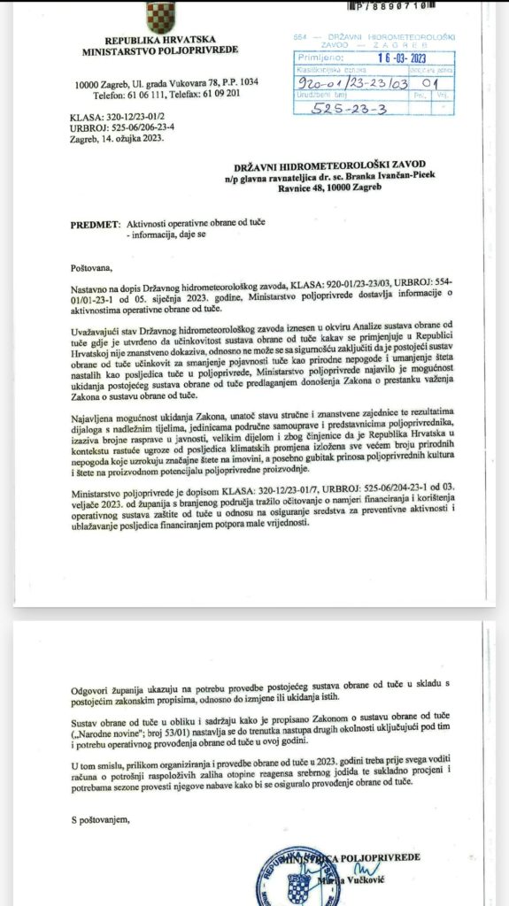 Ekskluzivno donosimo dopise ravnateljice DHMZ-a s ministricom poljoprivrede i ministrom gospodarstva. Zakon o obrani od tuče zbog pritiska javnosti nije ukinut, pa je u DHMZ-u zavladala „panika“, jer do svibnja ipak trebaju organizirati „kakvu-takvu“ obranu od tuče. Vrijeme prolazi, a oni se dopisuju!