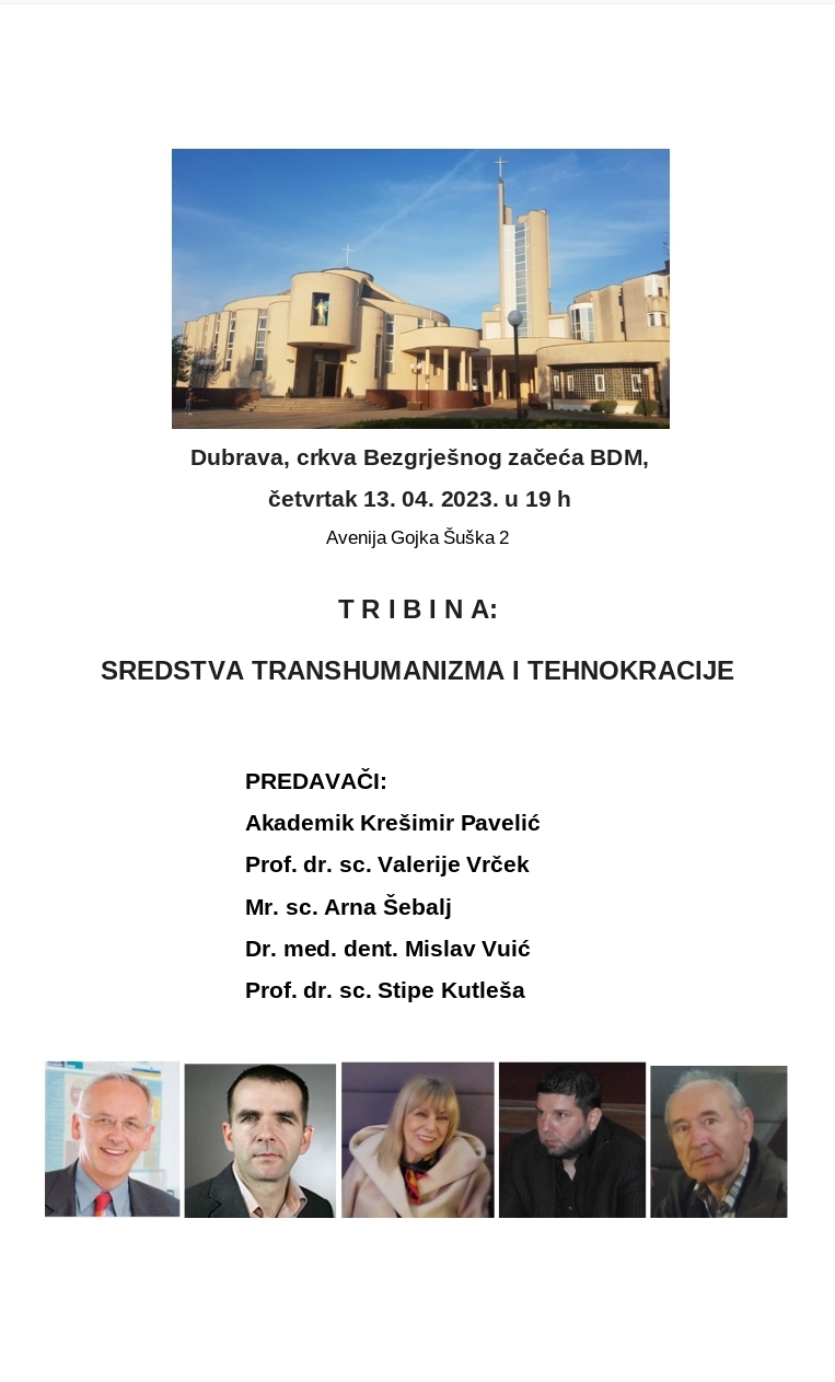 Večeras u Dubravi, u crkvi Bezgriješnog začeća BDM u 19 sati: Akademik Krešimir Pavelić, Prof. dr. sc. Valerije Vrček, Prof. dr. sc. Stipe Kutleša, Mr. sc. Arna Šebalj, Dr. med. Mislav Vuić